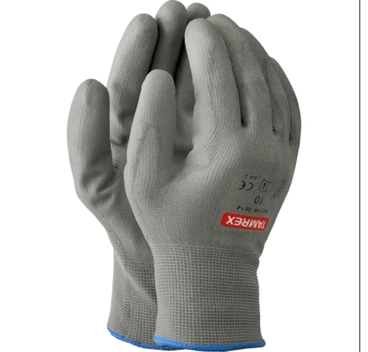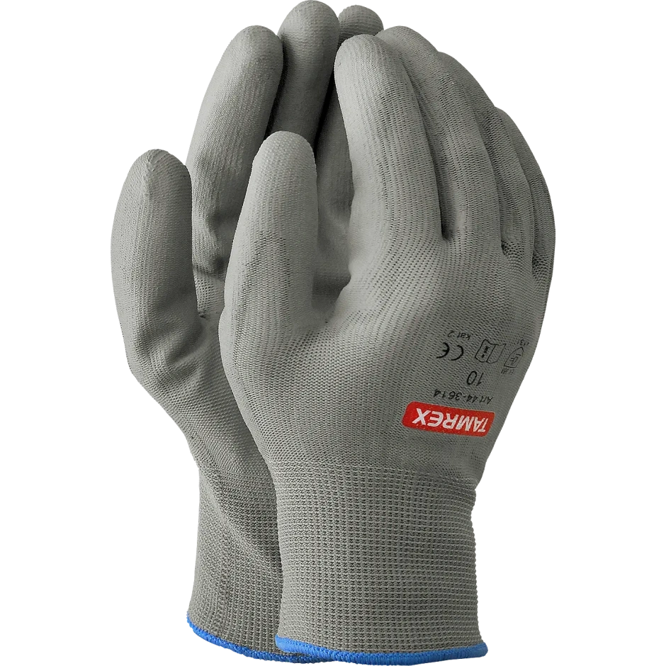 Hallid õmblusteta nailonist kootud töökindad. Peopesa on kaetud halli polüuretaanist pealiskihiga. Mugavust lisab elastne kootud randmeosa. Nailonist aluskindal on polüuretaaniga kaetud peopesa, mis kaitseb käsi mehaaniliste ohtude ja mustuse eest. Elastsed ja hingavad kindad on käes mugavad ja hea puutetundlikkusega.