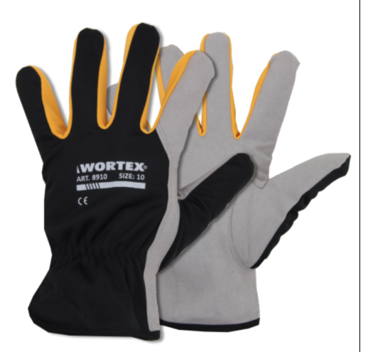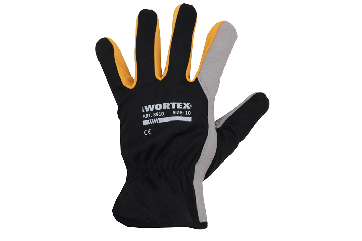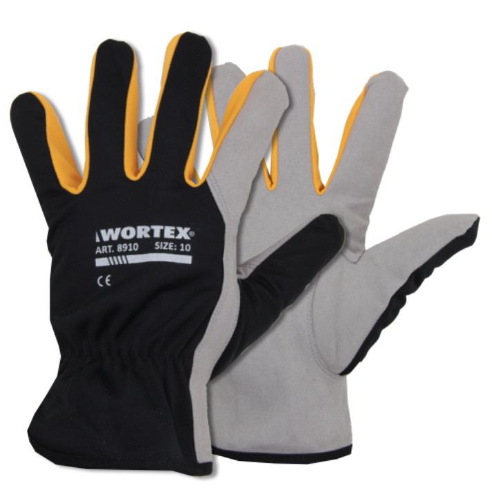 WORTEX 8906…8912 sünteetilisest nahast kindad. Kinda peopesa on sünteetilisest Superfiiber materjalist, mis imiteerib nahka ning tagab kõrge ja ühtlase kvaliteedi. Käeselja kangas on mustust ja niiskust hülgavast polüestrist, randmel sisse õmmeldud elastne kummisoonik. Töökindad on mugavad, hea kulumiskindlusega ja puutetundlikusega.